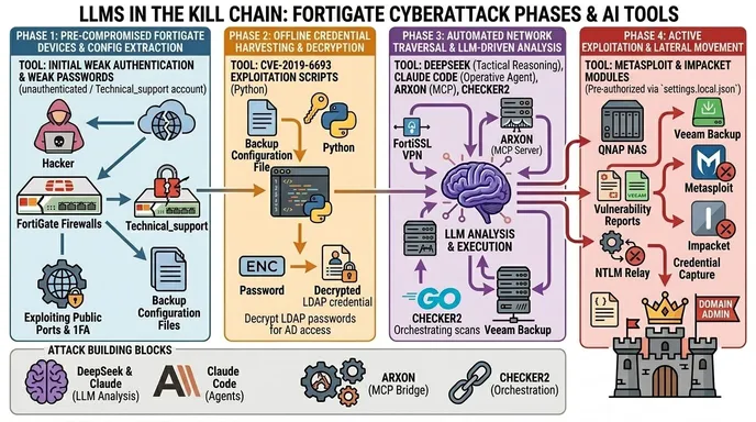 ENC). Utilizzando script in Python (probabilmente legati alla vulnerabilità CVE-2019-6693), l'attaccante ha decriptato queste password offline, ottenendo credenziali valide per la rete. - Analisi guidata dall'IA (LLM-Driven Analysis): Con una mappa della rete e credenziali valide, l'attaccante si è connesso internamente tramite la VPN FortiSSL. A questo punto, il flusso è diventato automatizzato: i dati di ricognizione e i risultati delle scansioni della rete interna sono stati inviati all'IA tramite un server MCP (Model Context Protocol). L'attaccante chiedeva ai modelli linguistici di valutare l'accesso attuale, trovare vettori di attacco per bersagli non ancora raggiunti, individuare dove cercare credenziali nei Domain Controller e tracciare il percorso prioritario per diventare Amministratore di Dominio (Domain Admin).